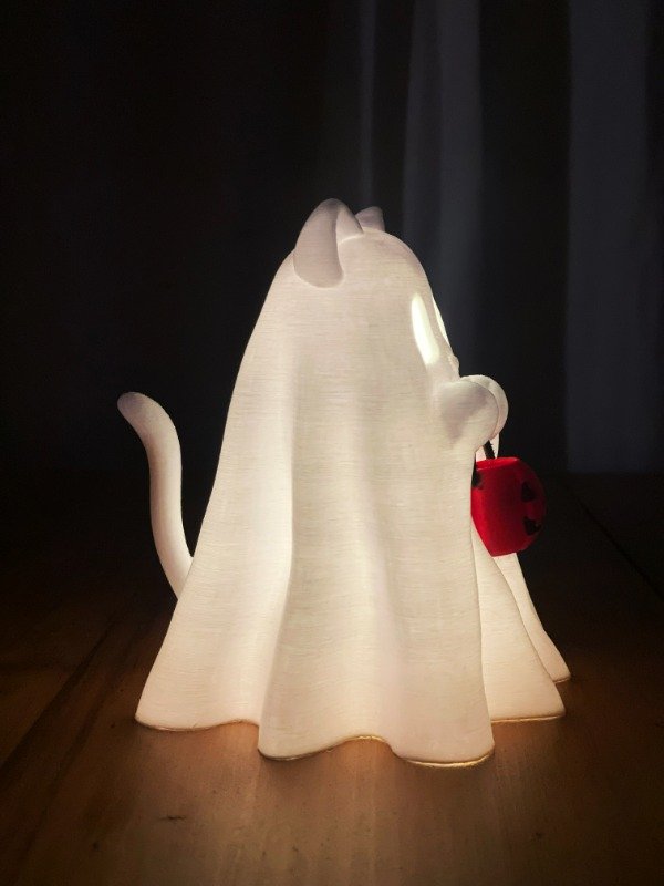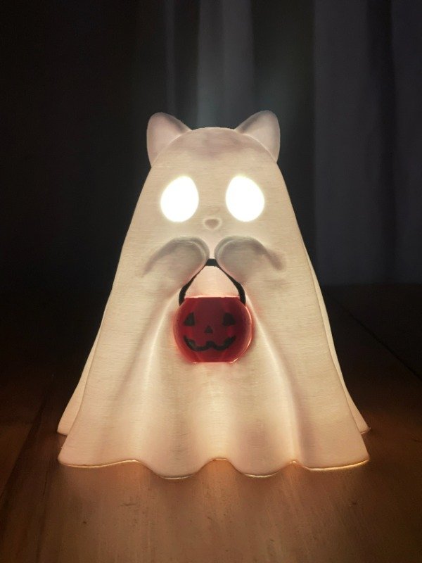 Escultura de Gatito Fantasma. Diseño propio, esculpido digitalmente a mano, impreso en material PLA y pintado a mano.